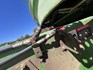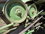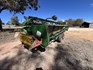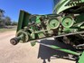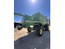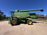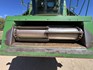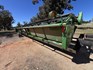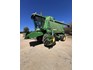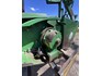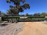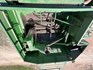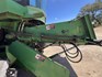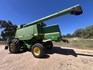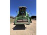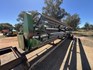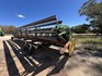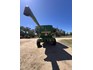 3 speed Hydrostatic transmission, 7100L Grain Bin, Chopper, 30.5 32 and 16.9 26 Tyre package, standard lights package, Air operated main seat + passenger seat, UHF and Tape Player, coupled with a John deere 930R front, Single knife drive, batt reel, standard knife guards, table auger, sitting on a farm trailer with single front axle and dual rear axle, rear oversize sign.